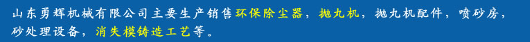 歡迎進入山東勇輝機械有限公司官網(wǎng)!我公司主要產(chǎn)品有環(huán)保除塵器,消失模鑄造工藝,拋丸機及配件。!